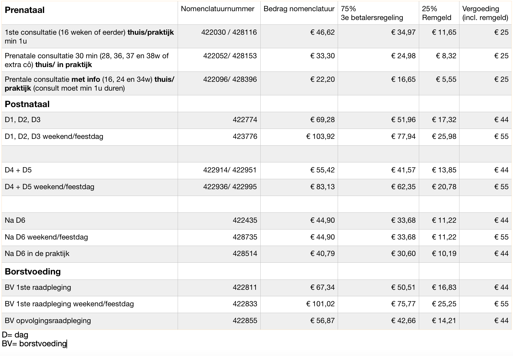 Als vroedvrouw vind ik het belangrijk om voldoende tijd te kunnen nemen voor mijn patiënten. De huidige tarieven van RIZIV laten dit niet toe. Ik kies er dan ook voor om gedeconventioneerd te werken. Dit wil zeggen dat ik deels vergoed wordt door het RIZIV en ook een vergoeding vraag per bezoek. Deze is inclusief: vervoerskosten, materiaalkosten voor standaard wondzorg, dossierkosten en 24/7 bereikbaarheid.